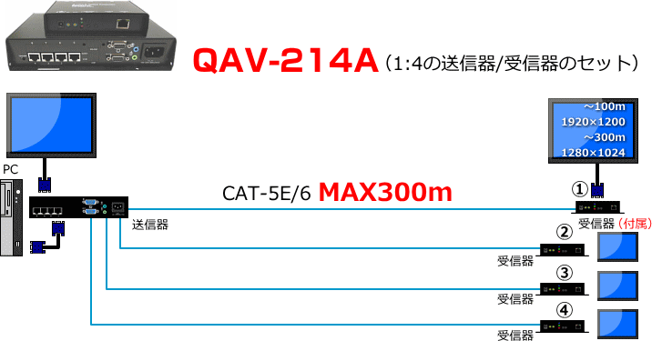 | 延長距離 | 10〜300m、QAV-RE(リピーター)使用時〜500m | ||