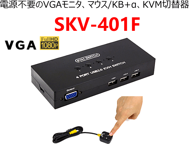 | 同梱内容 | SKV-401F本体×1、VGA+USB複合ケーブル(1.2m)×4、リモコンスイッチ(1.5m)×1、取扱説明書 | |
